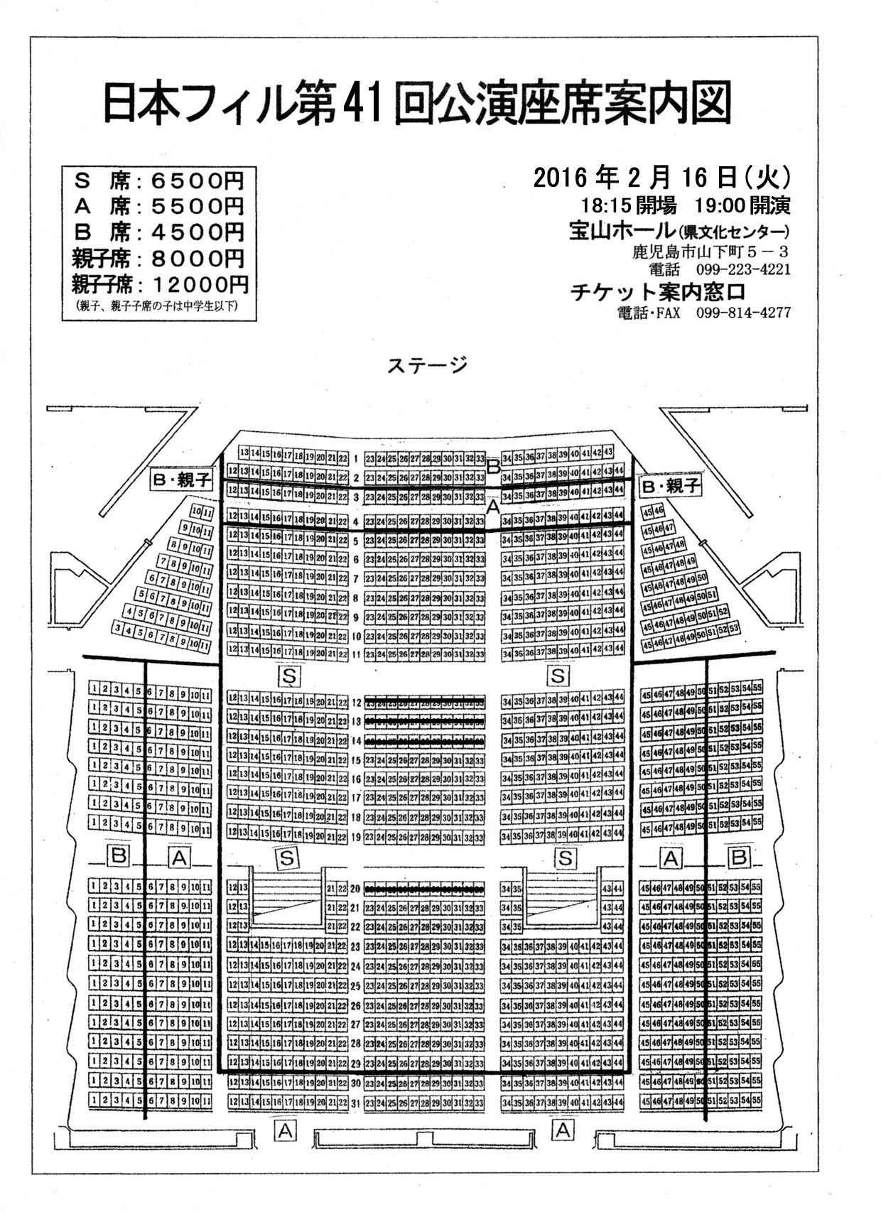 | 入場料金 | S:\6,500 A:\5,500 B:\4,500 親子:\8,000 親子子:\12,000 車いす席(チケット案内窓口受付のみ):\4,500 ※当日は500円増 |