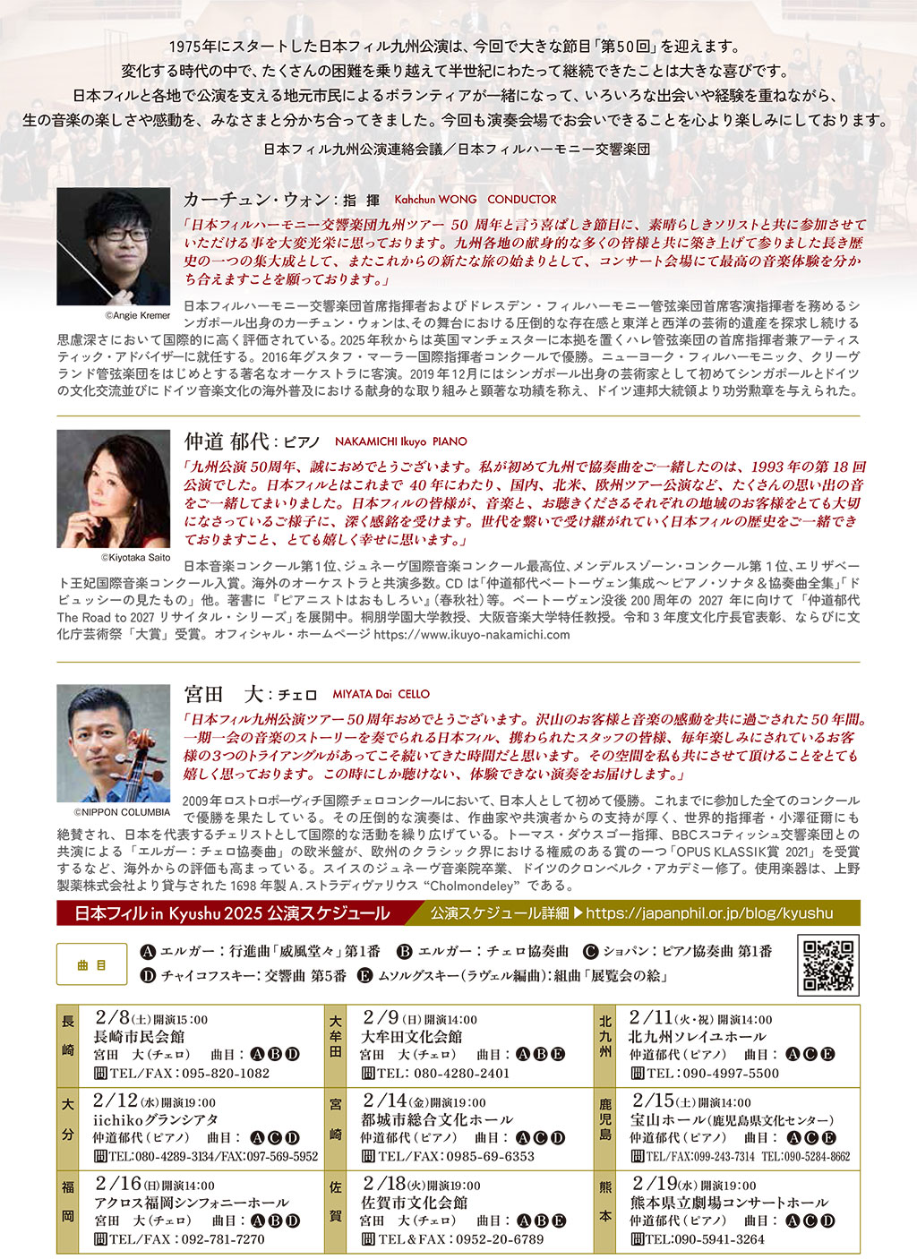日本フィルハーモニー交響楽団九州ツアー50周年と言う喜ばしき節目に、素晴らしきソリストと共に参加させていただける事を大変光栄に思っております。九州各地の献身的な多くの皆様と共に築き上げて参りました長き歴史の一つの集大成として、またこれからの新たな旅の始まりとして、コンサート会場にて最高の音楽体験を分かち合えますことを願っております。